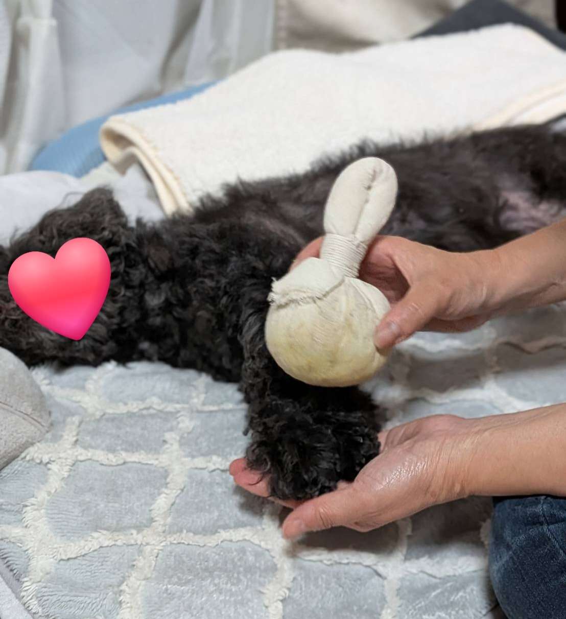 ぽかぽか温灸でゆっくり身体を温めて上げながらマッサージして上げるとピンと伸びていた手足が柔らかくなり走り回れるように軽く曲げて上げましたお首回りも皮膚が伸びるほど柔らかくなり気持ち良さそうに見えます(^-^)