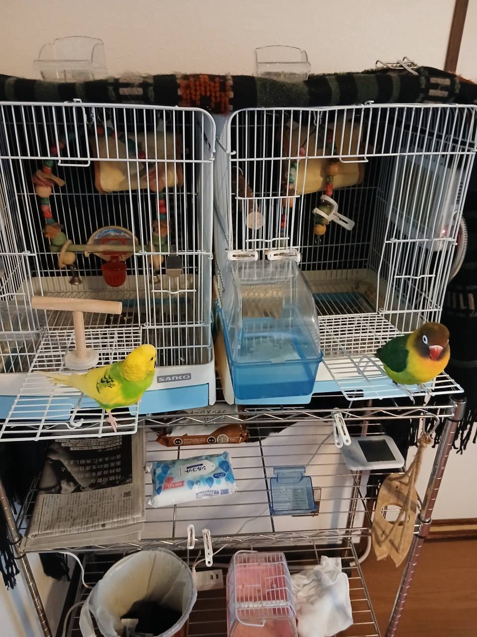 お食事.お水の入れ換え.新聞紙交換.放鳥のお世話をさせていただきました放鳥中は何度も私の肩にとまり